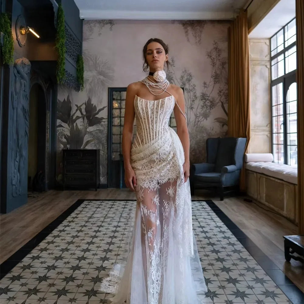 The Lorena Mini Dress is a stunning white lace prom dress that exudes elegance and sophistication. Its sexy illusion strapless design is accentuated with a boned corset, providing a flattering silhouette. Perfect for any special event, the detachable train and customizable fit make it a versatile choice for wedding parties and more.